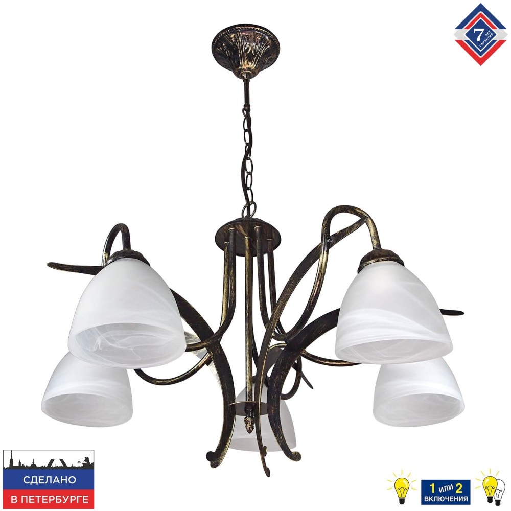 Люстра подвесная дизайнерская 5 плафонов большая черная с патиной золота российского производства ПЕТРАСВЕТ S3151-5, 5хЕ27 макс, 60Вт, цепь можно укоротить до 1 звена на 17 см, стиль - классический, арматура - металл, размеры светильника (LxWxH) - 68x68x76, вес - 3 кг, Люстра на 2 включения, Люстра подвесная и для натяжных потолков и освещение 20-25 м2 помещения в зависимости от мощности лампочек Е14, Люстра подвесная цепная 5 рожковая черная с патиной золота подходит для освещения комнат, кабинета, гостиной, спальни, столовой, детской, кухни, Заводская гарантия 7 лет, Люстра просто собирается, Подвесной светильник на 5 лампочек произведен и проверен на производстве, плотно упакован в коробке из тройного гофра картона, Лампочки светодиодные LED подбираются по следующим параметрам: для яркого освещения - 3 Вт на 1 м2 комнаты, для среднего - 2 Вт на 1 м2, В случае боя или не комплекта, свяжитесь с нами мы вышлем Вам новый в день обращения,
